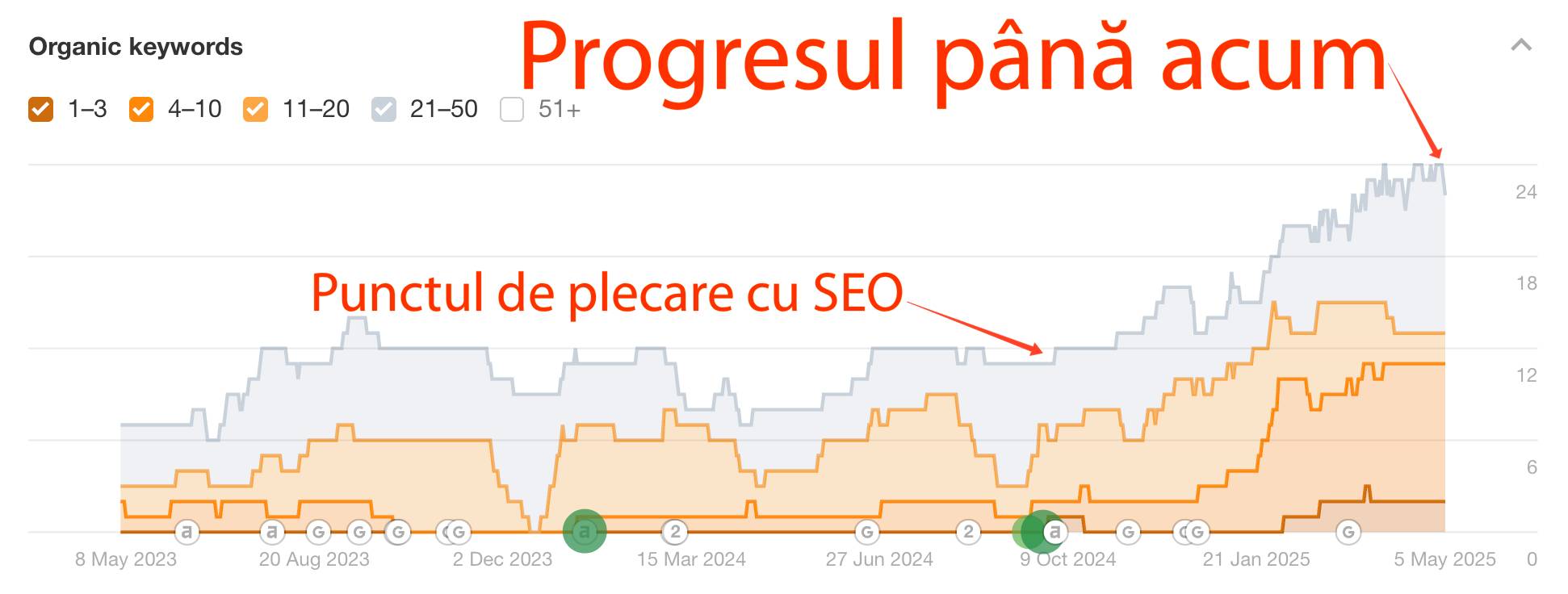 O vizibilitate extinsă pentru 39 cuvinte cheie, dintre care 11 sunt clasate pe prima pagina de rezultate Google.
