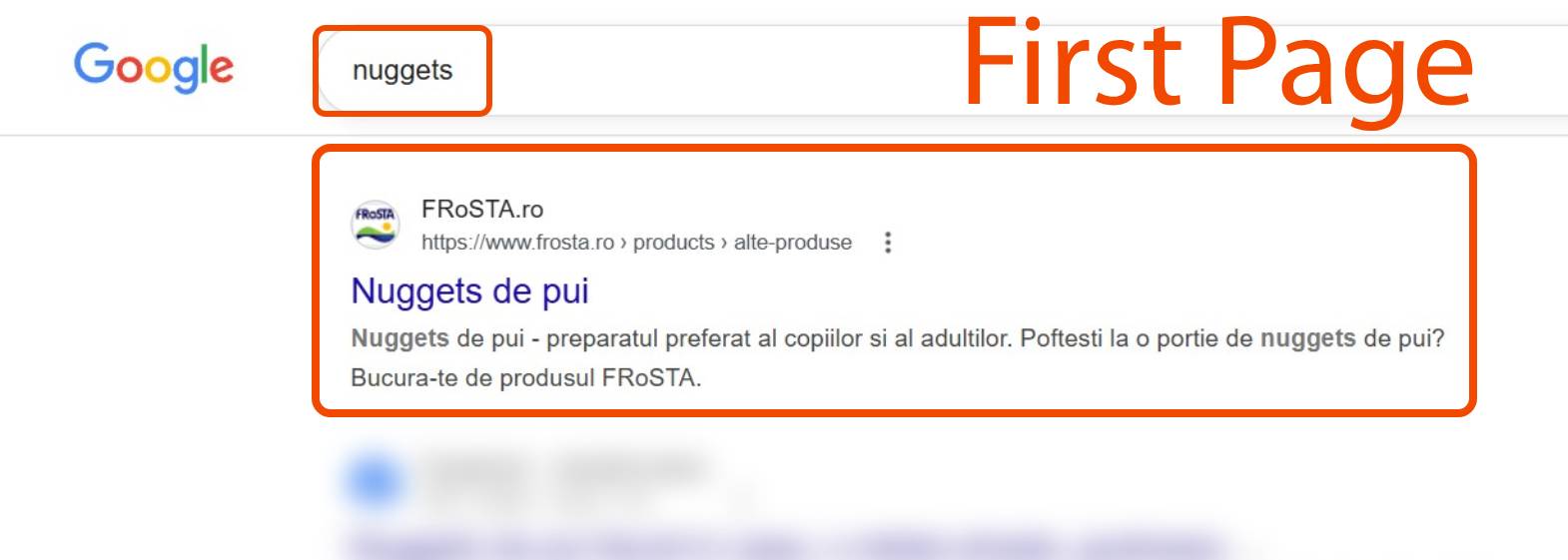 Pagina cu rezultatele căutării Google pentru "nuggets de pui", care prezintă un rezultat prezentat de pe frosta.ro cu o imagine a unui pachet de nuggets de pui.