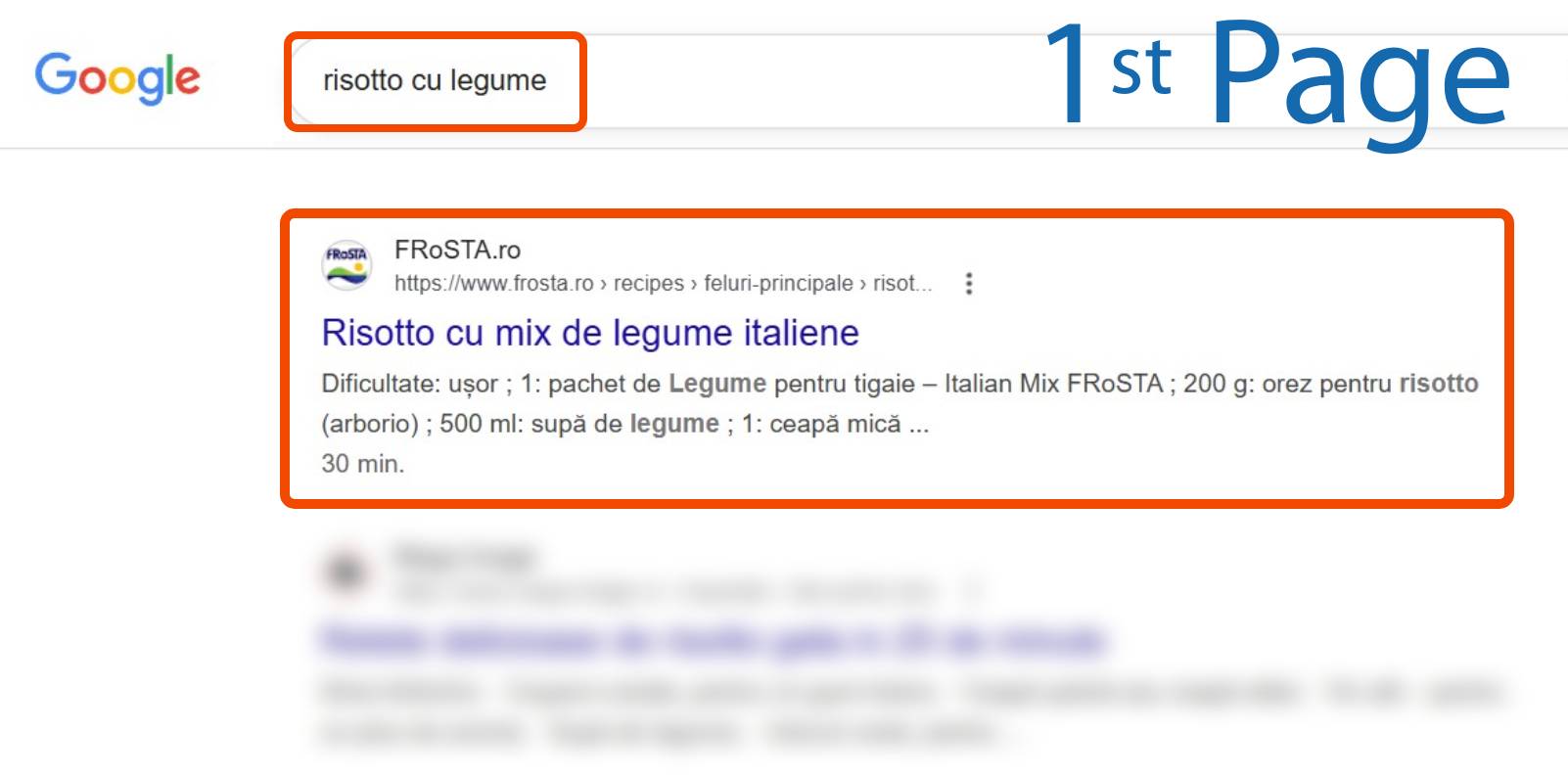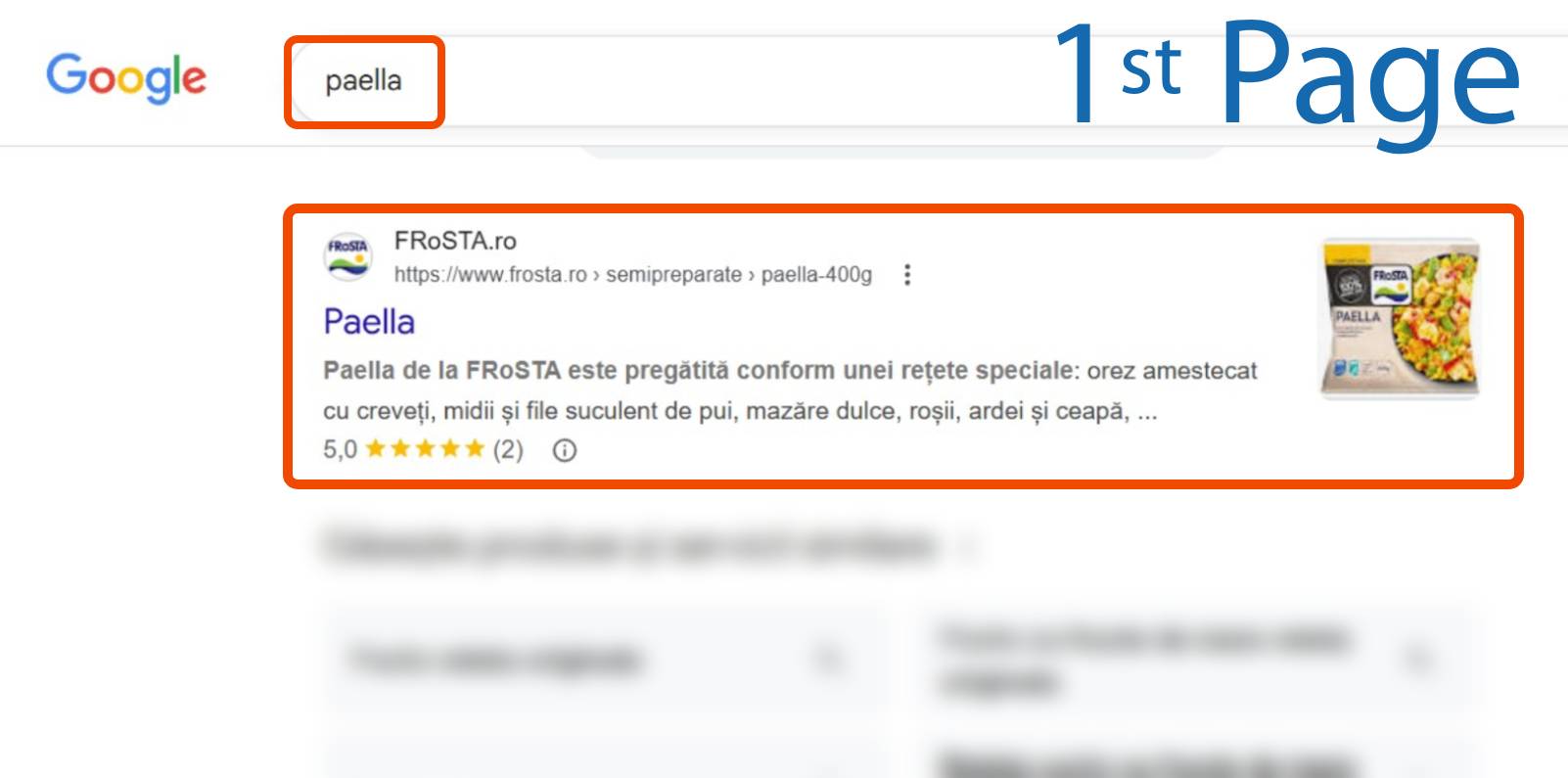 Rezultatele căutării Google pentru "paella", cu un link FRoSTA.ro care prezintă un fel de mâncare paella cu ingredientele enumerate în limba română, evidențiat pe prima pagină.
