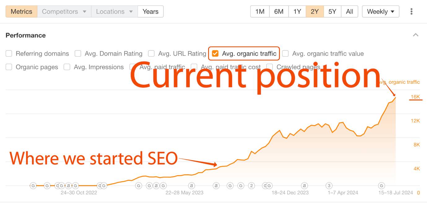 A steady increase that allowed the site to appear on the first pages of Google results.